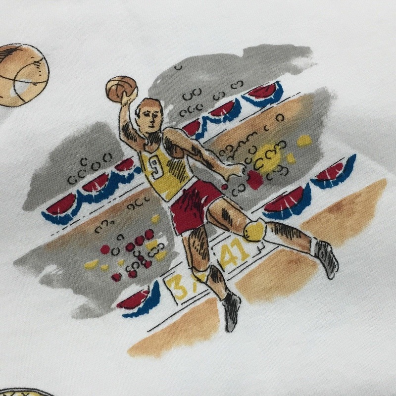 Basketball on White Cotton Jersey. This fabric has multiple basketball scenes. They are approximately 4″ wide.