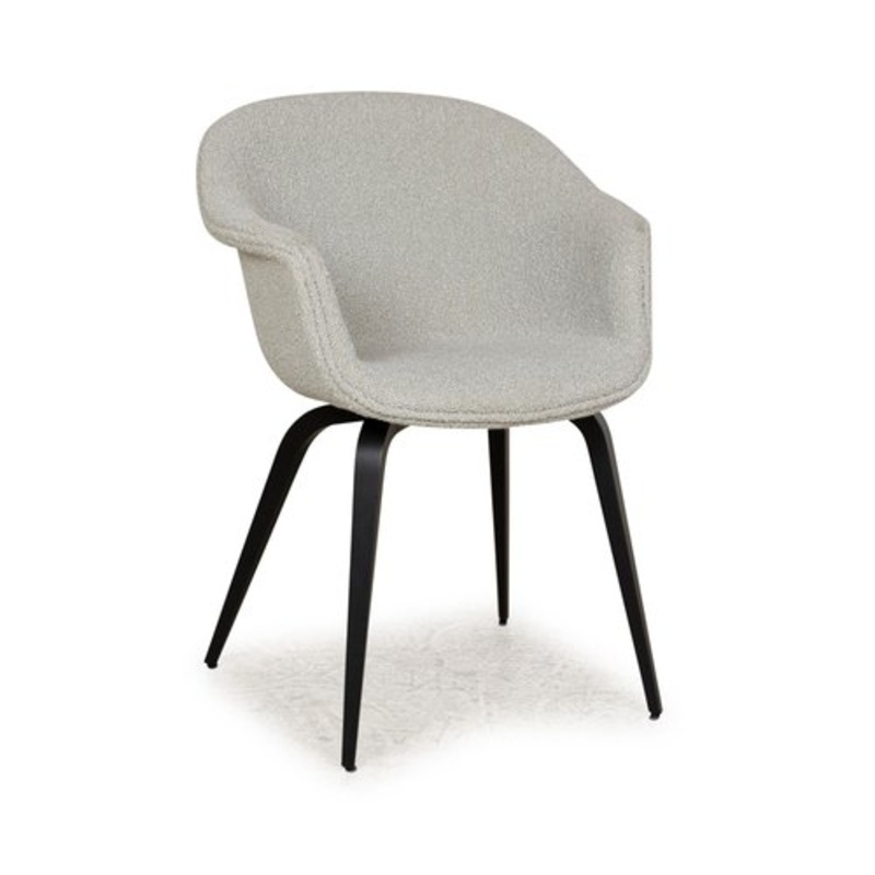 The BAT chair by Gubi is made with a seat shell covered in light gray fabric, which is mounted on elegant black wooden legs. The design creates an exciting contrast between the different materials and feels and the rounded seat shell with armrests invites