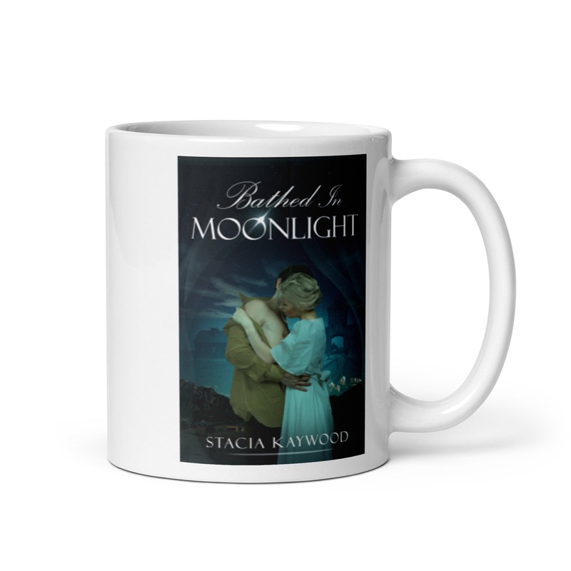 Whether you’re drinking your morning coffee, evening tea, or something in betweenthis mug’s for you! With beautiful cover art from Stacia Kaywood’s book, Bathed In Moonlight, the mug is sturdy and glossy with a vivid print that’ll withstand the microwave and dishwasher.