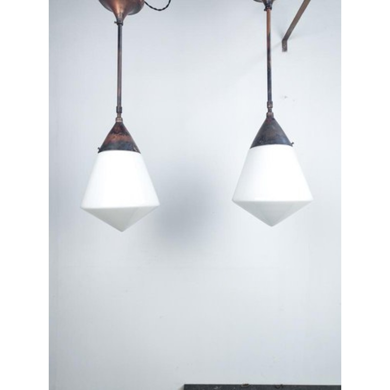 : Beautiful 1920s German Bauhaus Pendant light, constructed out a single pieces of opaline glass held by a beautiful discoloured gallery. These lights are rare examples of the conical version of the teardrop pendants produced and marketed by Siemens & Schuckert in the early 1900s. The lights have the original gallery, stem and ceiling cap.