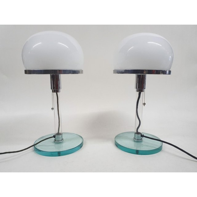 About this item This model is often called the Bauhaus lamp. It was designed in 1923 by Carl Jucker and Wilhelm Wagenfeld. In 1967 Carl Jucker finally found a company that could produce it. That company was Imago PD Italy. These were the first models that were produced and are more rare. They are different than the later models produced by Tecnolumen. The light stands on a massive glass foot. The cord goes trough a plastic transparant tube. They are both marked in the metal ring. Unfortunately one glass lamp shade was broken, and has been glued. Both lights have been checked and are in good working condition. They can be switched on with a pulling cord. Carl Jacob Jucker