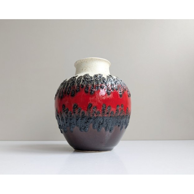This vintage vase from Bay Keramik is a bulbous ceramic vase from the 1970s. The vase impresses with its time-typical Fat Lava design in a timeless color combination in shiny dark red and brown, as well as natural beige in matt. Manufacturer: Bay Keramik -
