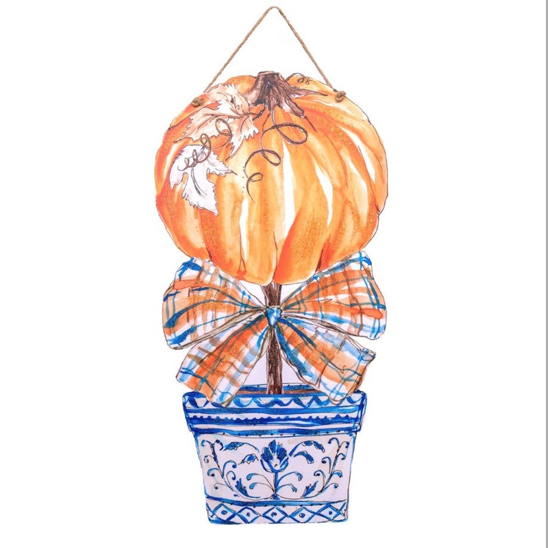 Becks Blue Pumpkin Door Hanger adds a fresh twist to fall dcor with its charming pop of cool blue. Perfect for giving your door a dash of seasonal whimsy, its a stylish way to welcome guests all autumn long!