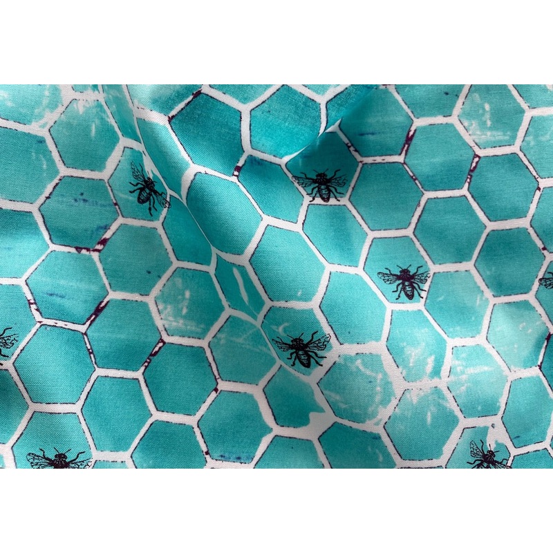 A quilting cotton in a print of our favorite bee pollinators in their mottled aqua honeycomb - this honey sweet cotton is perfect for blouses, quilting, gathered skirts, and tops. Made in Japan. 100% cotton. 45" wide.ter.com/ziyatong/status/157158544946197