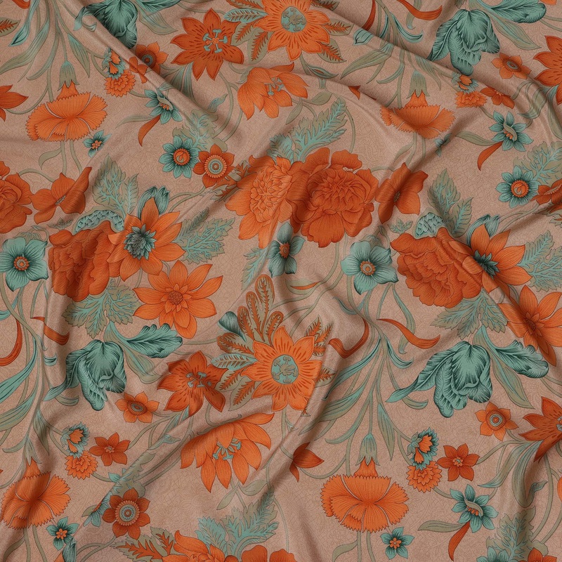 Celebrate nature-inspired elegance with this beige base pure silk crepe fabric adorned in a rich floral print featuring vibrant rust-orange blooms and soothing teal green leaves. The harmonious palette merges earthy warmth with refreshing contrast, giving