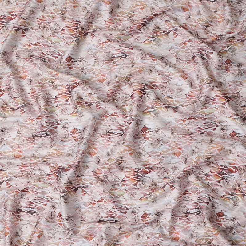 Add a touch of elegance to your sewing projects with this beige and brown cotton satin fabric, featuring a smooth texture and a subtle sheen for a refined look. The intricate geometric pattern, blended with abstract floral accents in earthy tones of beige,