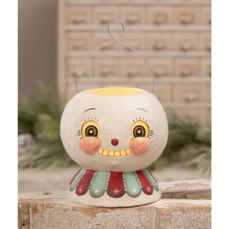 This snowman lantern features a glittering white face with a small smile, bright eyes, and blushing cheeks! His collar is made of an adorable scalloped design accented with dots and sparkles. Place a light inside and see him light up wonderfully! Light not included.Made by Bethany Lowe.Made ofPaper mache, vellum, glitter, and wire.Dimensions:7.5″ X 7.5″ X 7.75″.Item #: JP2033