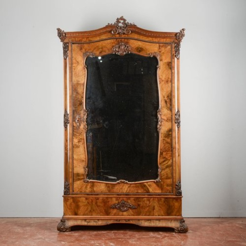 1-door wardrobe with mirror, walnut and briar structure, carved, Biedermeier style with little house at the base. Measurements 127 x 57 x h 210 cm Wardrobe CATEGORY Biedermeier STYLE DIMENSIONS: HEIGHT 210 cm WIDTH 127 cm DEPTH 57 cm DIAMETER cm COLOR: lig