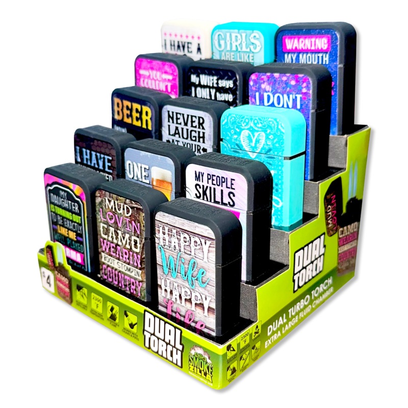 Light up your outdoor adventures with Big Bubba! This valued 15-piece display of dual torches features a refillable blue flame with an extra-large fluid chamber and soft-touch handle – perfect for camping, brazing, and even flaming food! So why spend lots of dough on a Zippo when you can save $$ and get Big Bubba?! Get lit and get wild! Display and pieces pre-priced @ $4.00.