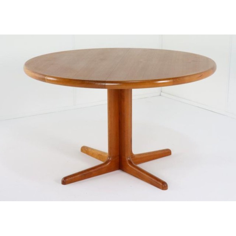 Beautiful dining room table made of teak in the Danish design language. This table with its beautiful warm teak and beautiful top is in a beautiful restored condition. Completely checked by our professionals in our own workshop. This was originally an extendable table, but the intermediate piece was lost in the past, so this table has been neatly converted into a fixed, sleek round table. Thanks to neat clamps, the table can now only be used as shown in the photo. If you ever make an intermediate leaf yourself, you can of course always use this. The condition can be described as exceptionally beautiful, the traces of use are minimal, given the age and purpose of use. We always recommend that you view the photos to get a complete picture of this beautiful item. The table has been restored with respect for the authentic appearance and the beautiful wood pattern so that it can provide years of living pleasure. A real design piece based on Danish design language in an uncommon version, an asset to your interior and a stable investment in your home; Go for proven quality and timeless class with this unique round table!