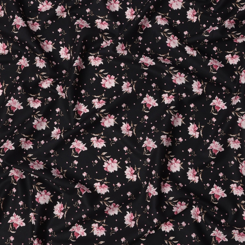 Elegant and bold, this black cotton lawn fabric is adorned with delicate pink and white floral prints, offering a timeless contrast that elevates any wardrobe. The soft blossoms are thoughtfully scattered across the rich black base, giving the fabric a gra