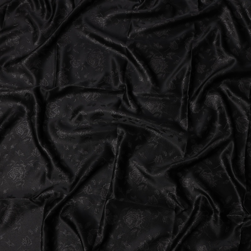 This black pure silk satin fabric, enriched with intricate floral self-designs, is a luxurious textile that exudes sophistication and timeless appeal, perfect for both ethnic and contemporary couture. Crafted in China, the fabric features a rich satin shee