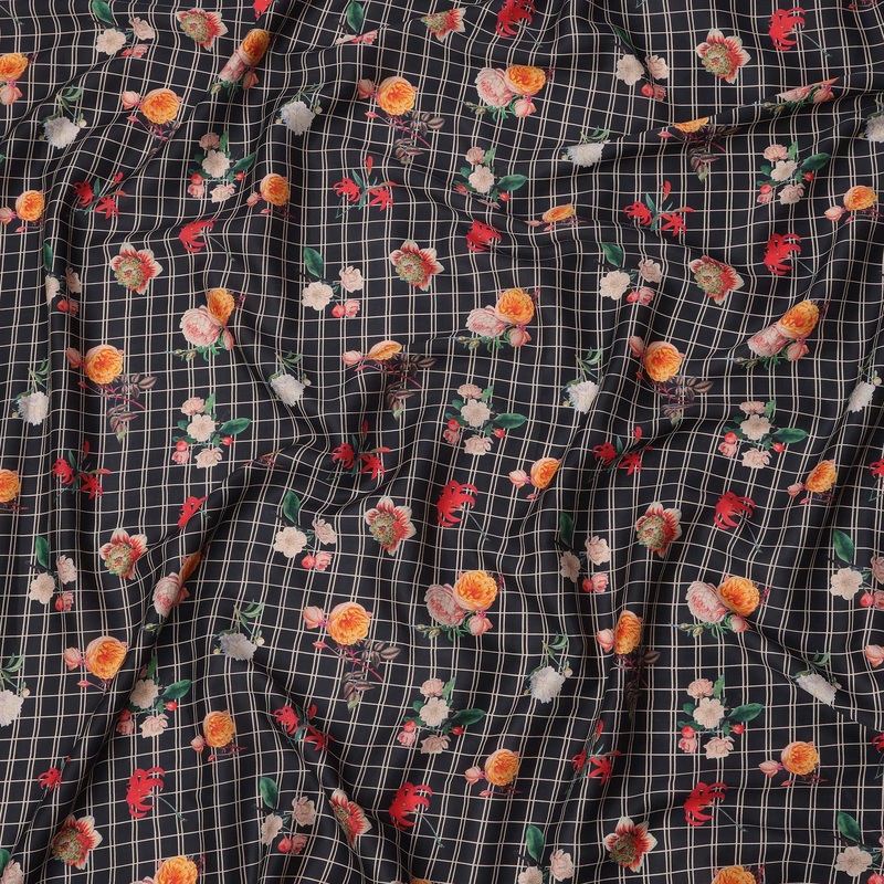 Immerse yourself in the elegance of this Black Grid Floral Printed Cotton Lawn Fabric, a charming blend of contemporary checks and timeless botanical beauty. Featuring delicately illustrated marigold yellows, soft ivory blooms, and lush red roses scattered