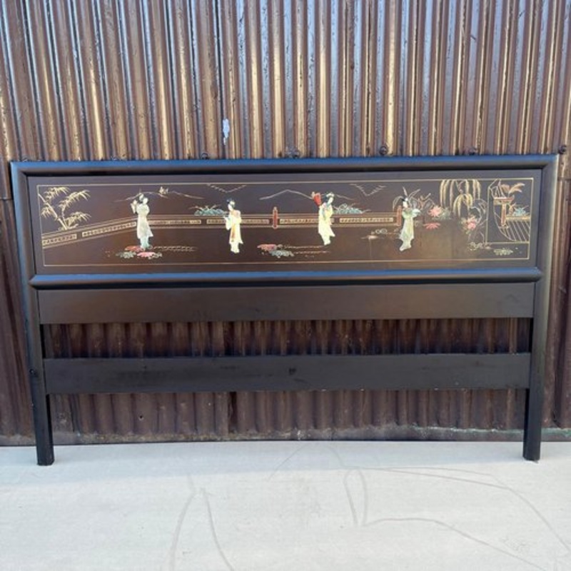 Black Laquered Chinoiserie Head board Detail includes 4 relief figures Dimensions 183cm width 118cm high 3cm depth Production Period Before 2010 Style Vintage Detailed Condition Good This vintage/antique item may have some wear such as scratches and other
