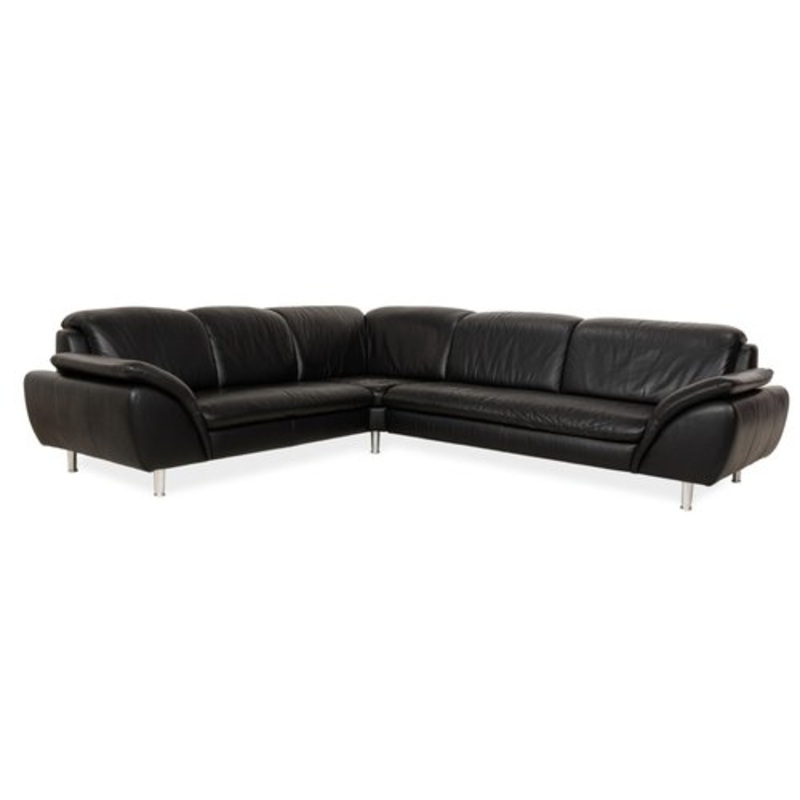 The Willi Schillig corner sofa impresses with its high-quality deep black leather. This not only ensures maximum comfort, but also makes the sofa appear elegant and stylish in combination with the subtle metal feet.