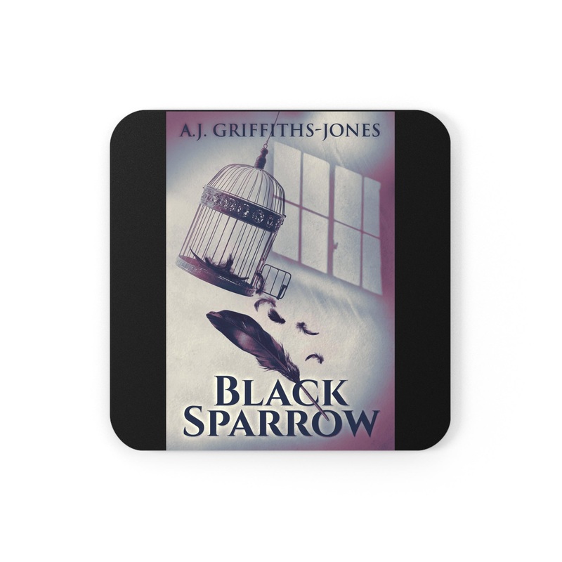 These coasters are made with a high-gloss top and feature a cork back to prevent sliding, and each order comes with a set of four coasters. The cover art in these coasters is from A.J. Griffiths-Jones's book, Black Sparrow.