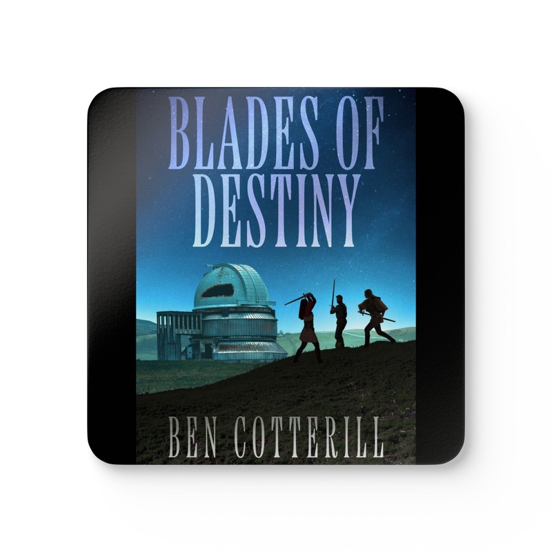 These coasters are made with a high-gloss top and feature a cork back to prevent sliding, and each order comes with a set of four coasters. The cover art in these coasters is from Ben Cotterill’s book, Blades of Destiny.