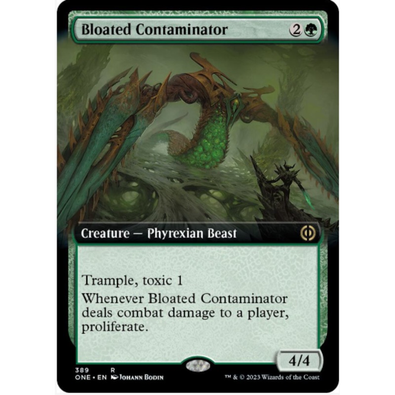 Trample, toxic 1Whenever Bloated Contaminator deals combat damage to a player, proliferate.Rarity:R#:389Card Type:Creature Phyrexian BeastP / T:4 / 4Casting Cost:2G