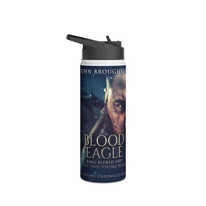 Quench your thirst in style with this 18oz stainless steel water bottle featuring a double-wall stainless steel build that keeps your drinks frosty for 24h and soothingly hot for 12h. This BPA-free, steel water bottle comes with a twist-on lid for easy sipping, making it excellent for daily use at work, at college, in the car, and beyond. The cover art in this water bottle is from John Broughton’s book, Blood Eagle.