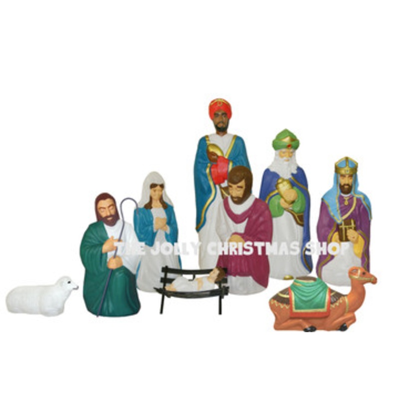 10pc outdoor life size nativity includes Mary, Joseph, Jesus in crib, Three Wisemen, Shepherd, One Sheep, and camel.