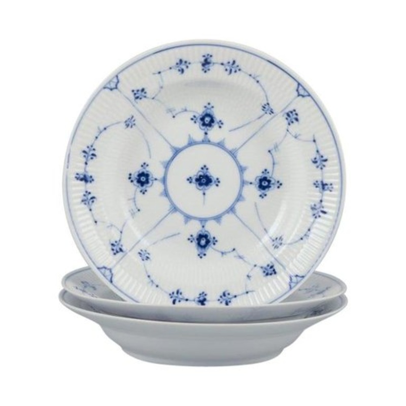Royal Copenhagen Blue Fluted Plain. Three deep plates in porcelain. Model: 1/165 Dating: 1954 One plate in first quality. Two in third quality. In perfect condition. Marked. Dimensions: D 24.5 cm. x H 5.0 cm.