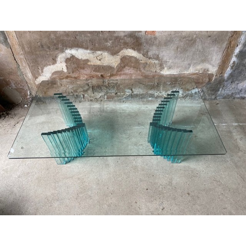 Glass table with blue reflectionsA few micro scratches on the tray and chips on the feet, very correct vintage years of 1980sThe tray is just placed on both feet, you can guide and position your feet as you wish.Length 125cmWidth 74cmHeight 38cmWeight 40kg