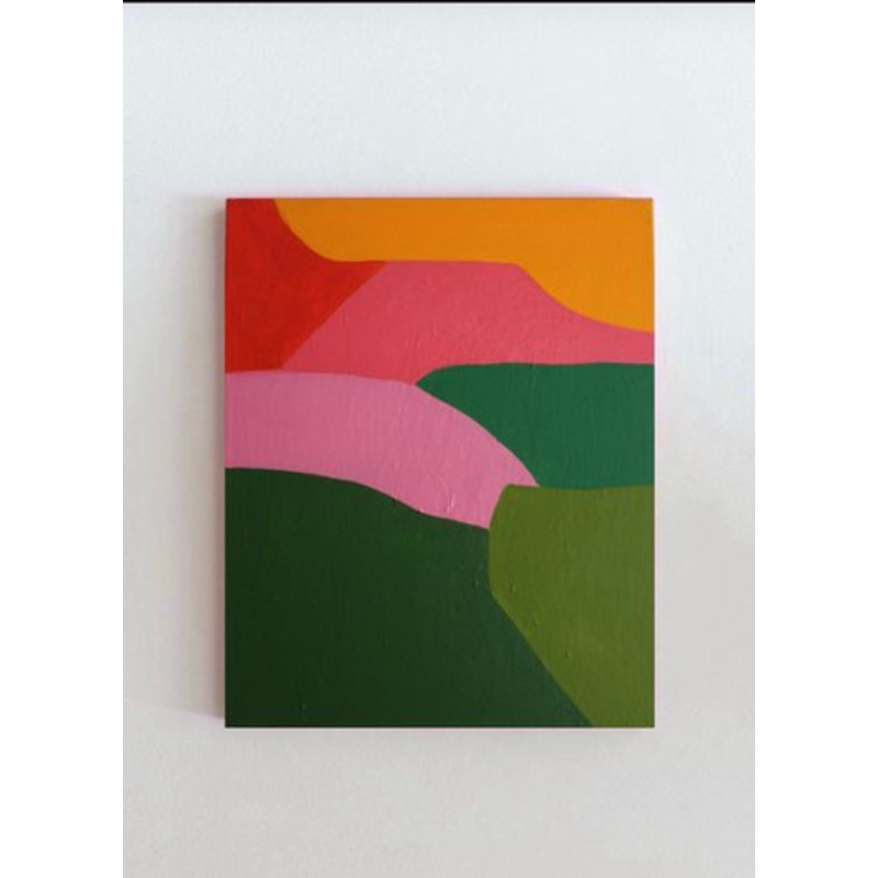 Contemporary abstract entitled Fields at dusk. Shades of green come together with shades of pink to form a luminous harmony. It will be perfect in any small corner of a living room or office. It is an acrylic painting on cotton canvas stretched on a frame,