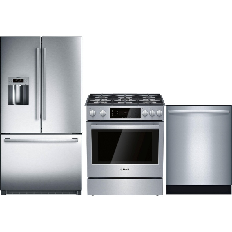 Bosch 3-piece kitchen package. This 24.8 cu.ft. french 3-door refrigerator features MultiAirFlow Cooling System, LED lighting, external water and ice dispensing system and a Stainless SteelTouch control panel. The 30-inch wide slide-in gas range offers a 4.8 cu.ft. oven capacity and features 9 specialized cooking modes, standard convection and 5 sealed cooktop burners. Completing this 3-piece kitchen package is a 24-inch wide dishwasher with 6 wash programs, sanitize option, PureDry Drying System and can accommodate up to 14 place settings.