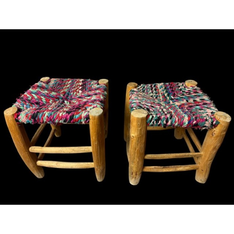 Boucherouite stool Unique piece, entirely handmade by Marrakchi cabinetmakers.Height 33 cm, seat 32/32 cm.The seat of this original stool is entirely hand-woven from recycled cotton scraps.The body of the stool is made of raw lemon wood.Ideal in a child's