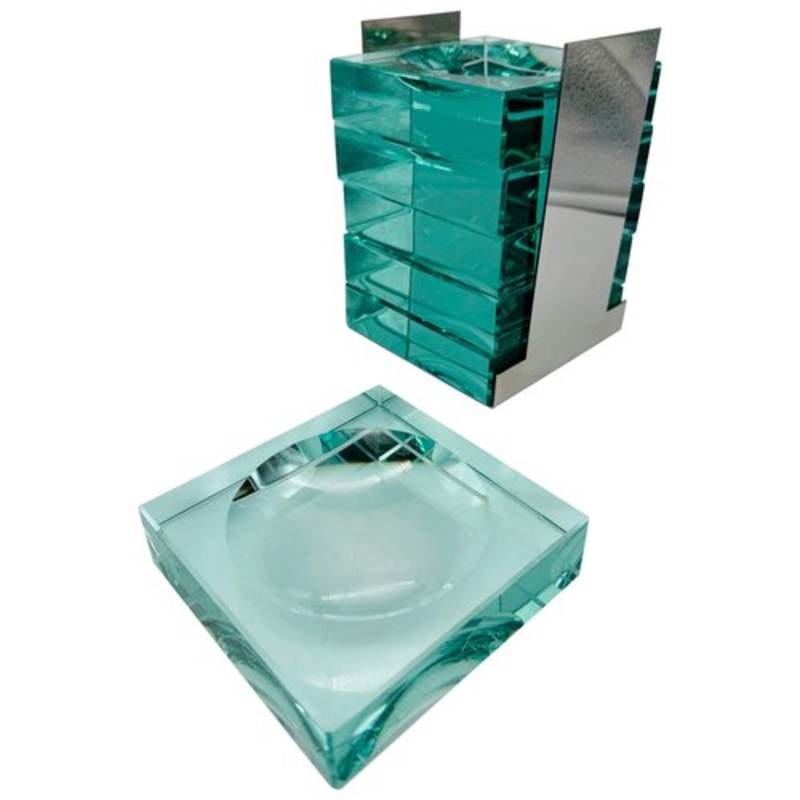 Set of 6 bowls or ashtrays made of emerald-colored glass with a steel holder. Designed by Gallotti & Radice in the 1970s, Italy 11cm x 11 cm High : 3 cm. Design Period 1970 to 1979 Year 1970 Production Period 1970 to 1979 Style Vintage Detailed Condition E