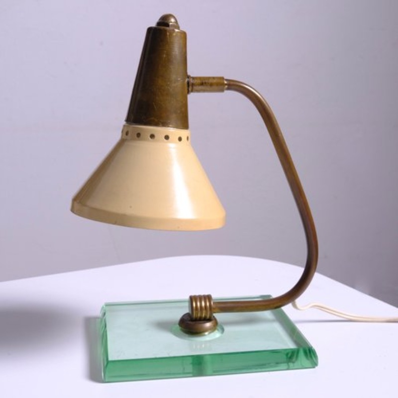 Light wear consistent with age and use, In buone condizioni, funzionante, consueti segni d’usura sul paralume in metallo, si segnala una piccola goccia di colla sul cono in ottone (vedi foto) probabilmente la parte in questione stata risaldata. Il cono con il paralume mobile, le eventuali i