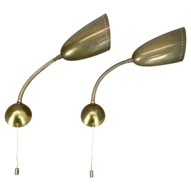 Article: Wall light, set of 2 Origin: Italy in the manner of Stilnovo, Gio Ponti Age: 1950s This modernist light set was produced in Italy in the 1950s in Italy. It is made of brass (wall fixation) and metal (spot shade element); they feature a very unique form with one socket for e 27 light bulbs inside each shade element. each light has a round wall fixation with one flexible metal arm that can be adjusted into several different position. as the sockets of the light are covered by multicolor shade metal element with hole pattern structure, they create a nice atmosphere of defused light. The light remains in a good all original vintage condition due to the age with normal brass surface patina and traces of use. The light is a full working condition. newly wired. Dimensions: Height 17cm Depth 31cm Length 9 cm