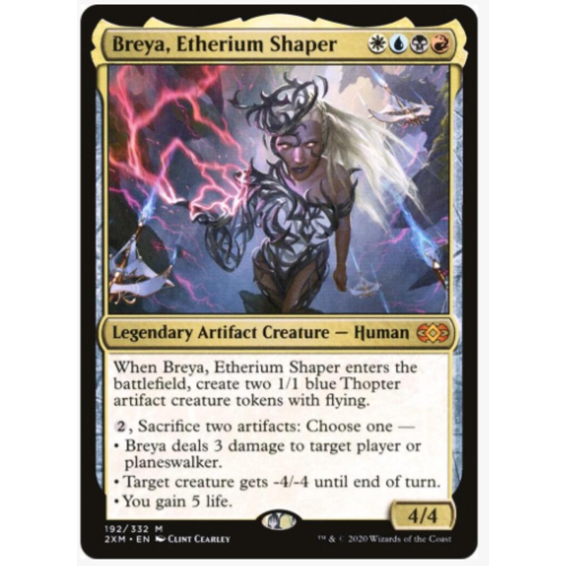 When Breya, Etherium Shaper enters the battlefield, create two 1/1 blue Thopter artifact creature tokens with flying.2, Sacrifice two artifacts: Choose one Breya deals 3 damage to target player or planeswalker. Target creature gets -4/-4 until end of turn.