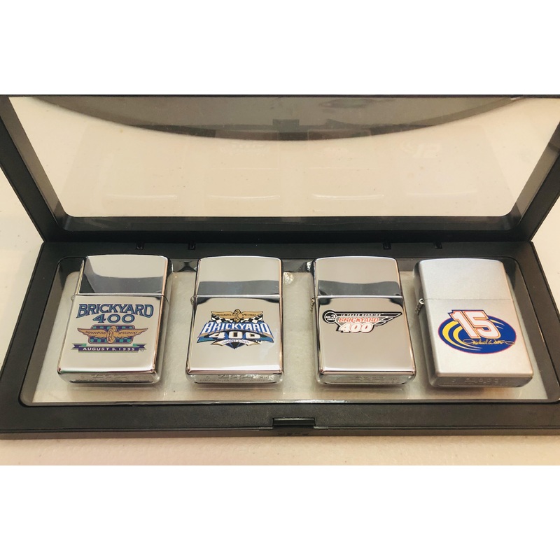 Gem Mint never fired 4 piece lighter set in clear display! 1995 Brickyard 400; 1996 Brickyard 400; 2002 Brickyard 400 & 2004 #15 Michael Waltrip. All lighters Gem Mint unfired three with seal intact on reverse. Pictures can't do justice to the shine on the