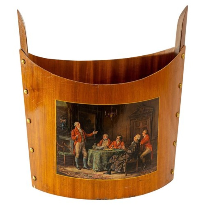 Teak basket, 1950s. Rare waste paper basket made of fine teak wood connected at the sides with brass studs. The exterior features a silkscreen print by Margaret Dovaston, a British painter best known for her detailed depictions of imaginary English interio