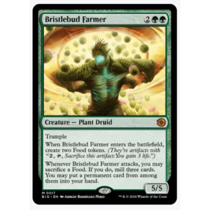 TrampleWhen Bristlebud Farmer enters the battlefield, create two Food tokens.(They're artifacts with "2, T, Sacrifice this artifact: You gain 3 life.")Whenever Bristlebud Farmer attacks, you may sacrifice a Food. If you do, mill three cards. You may put a