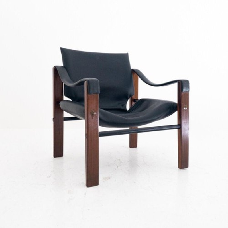 Splendid Safari armchair designed by Maurice Burke in the 70s for the British company producing Arkana furniture. The teak wood armchair is covered in black eco -leather, presents the Arkana brand under the session.