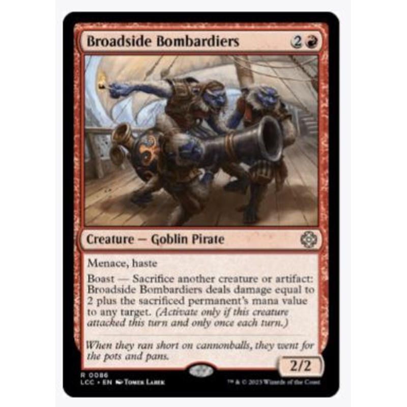 Menace, hasteBoast Sacrifice another creature or artifact: Broadside Bombardiers deals damage equal to 2 plus the sacrificed permanent's mana value to any target.Rarity:R#:86Card Type:Creature Goblin PirateP / T:2 / 2Flavor:When they ran short on cannonbal