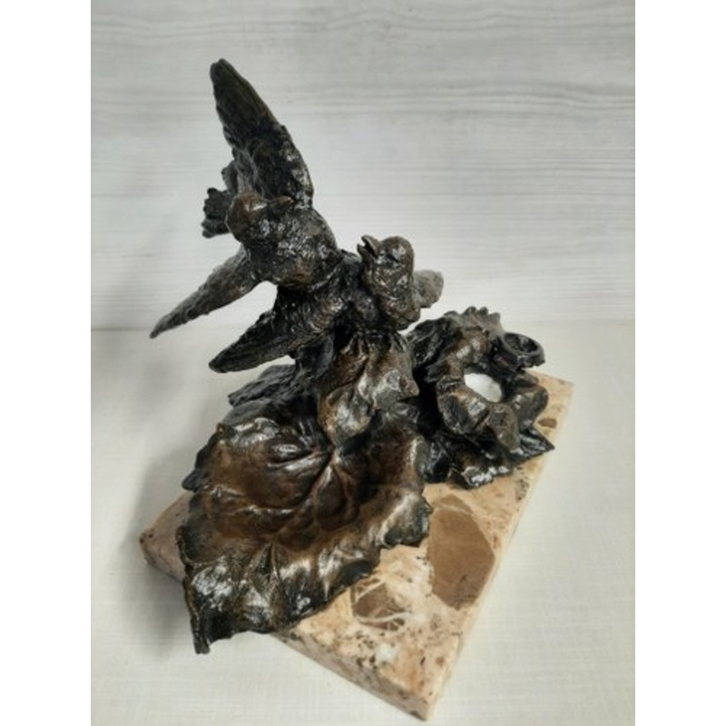 Splendid inkwell depicting two birds sitting on a plant.The ink container is made inside the flower.Small chip (visible in the photo) on one corner of the marble base.Patina of time makes it dark to the eye with bronze-colored reflections.It is in excellen