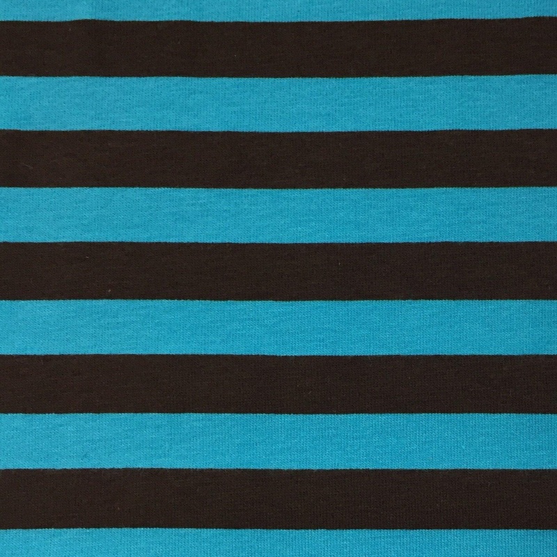 Brown and Blue 1/2" Stripes on Cotton/Spandex Jersey.This fabric is 60" wide and weighs 200 GSM.90%cotton/ 10% spandexStretches approximately 75% in width and 45% in length.
