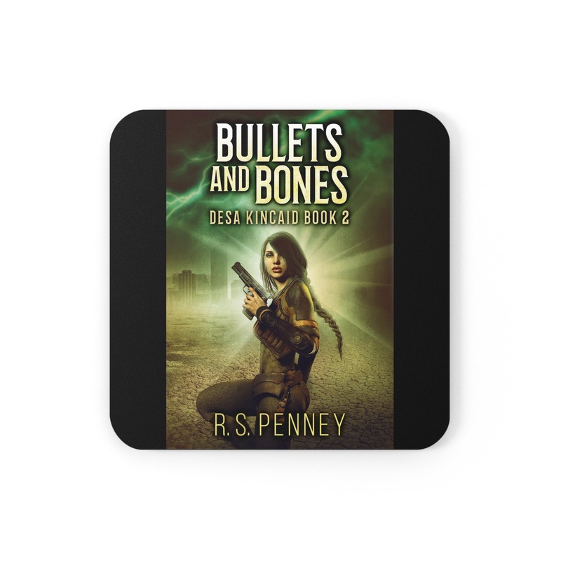 These coasters are made with a high-gloss top and feature a cork back to prevent sliding, and each order comes with a set of four coasters. The cover art in these coasters is from R.S. Penney’s book, Bullets And Bones.