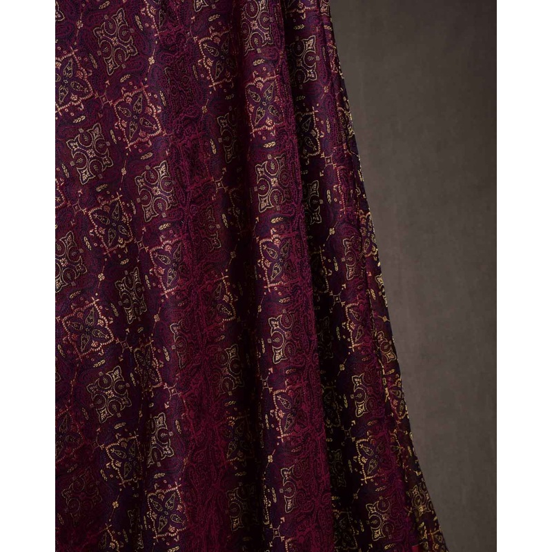 Woven in a luminous shade of purple/magenta, this Banarasi fabric features the timelessJamawar designan intricate and flowing arrangement that fills the field with regal rhythm. Gold zari glints softly across the katan silk base, creating depth and elegance without overwhelming the eye.