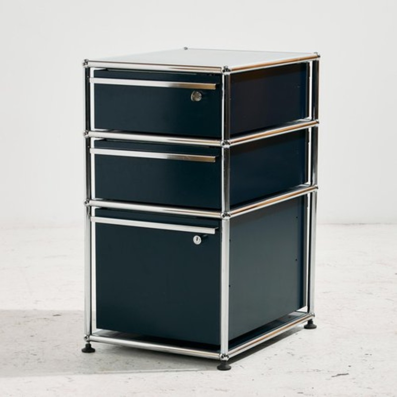USM Haller office furniture from the 2000s designed by Fritz Haller and Paul Schrer. The furniture has three drawers that can be locked with a key. with some surface scratches and wear on the metal and chrome parts. Creator Paul Schrer Manufacturer USM Hal
