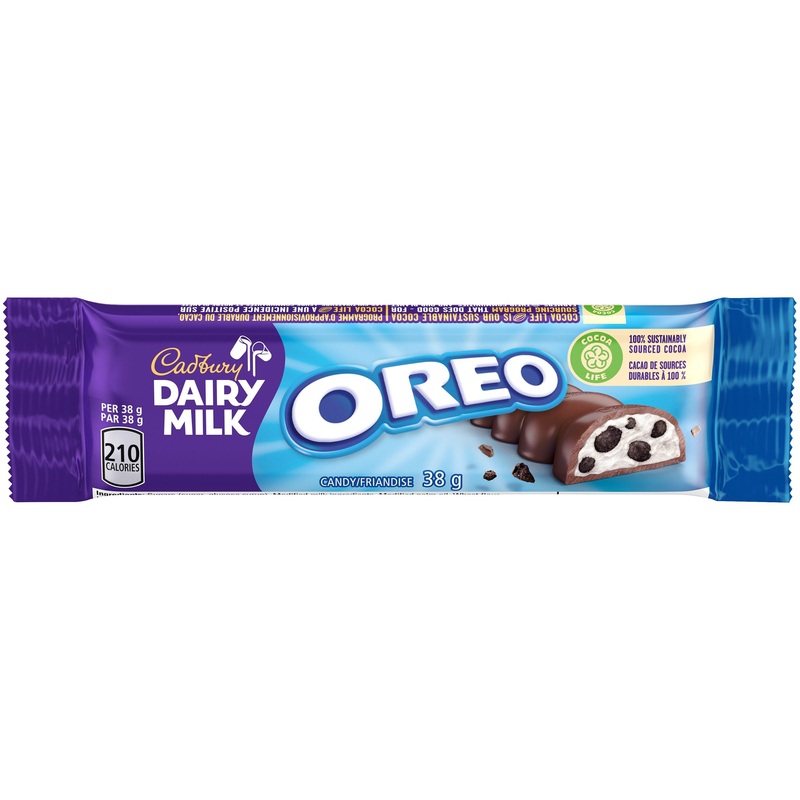 Delicious Cadbury Dairy Milk on the outside combined with crunchy OREO cookie bits and smooth vanilla crme on the inside