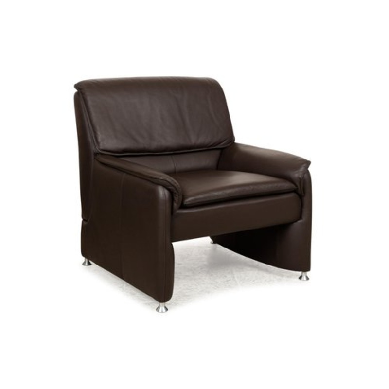 The Camaro armchair from Laauser is covered in dark brown leather and stands on almost floor-to-ceiling side panels that end in small plate feet. It is characterized by its classic design and has height-adjustable headrest elements.