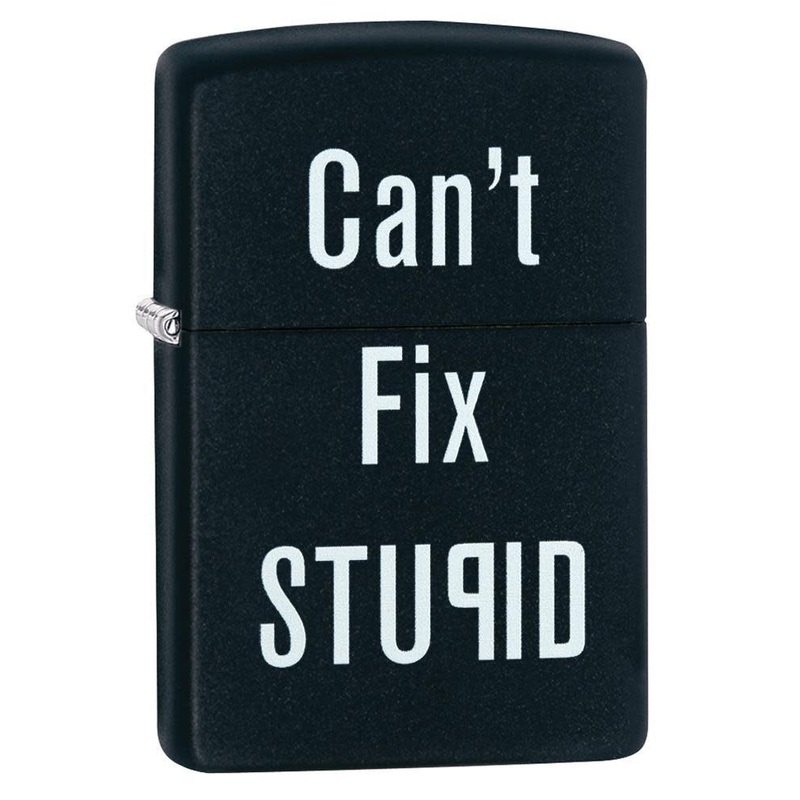 Get a laugh with this "Can't fix stupid" black matte windproof lighter. Comes packaged in a gift box. For optimal performance, fill with Zippo lighter fuel. Genuine Zippo windproof lighter with distinctive Zippo "click" All metal construction; windproof de