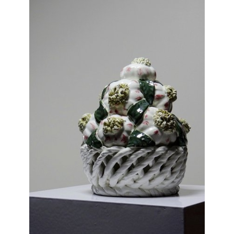 Old trompe l'oeil, small centerpiece, in hand-painted artisanal glazed ceramic, majolica, slip, Italian manufacture. Featuring a small white basket filled with 9 garlic cloves in a pyramid in shades of white, dark pink, yellow/cream, decorated with green l