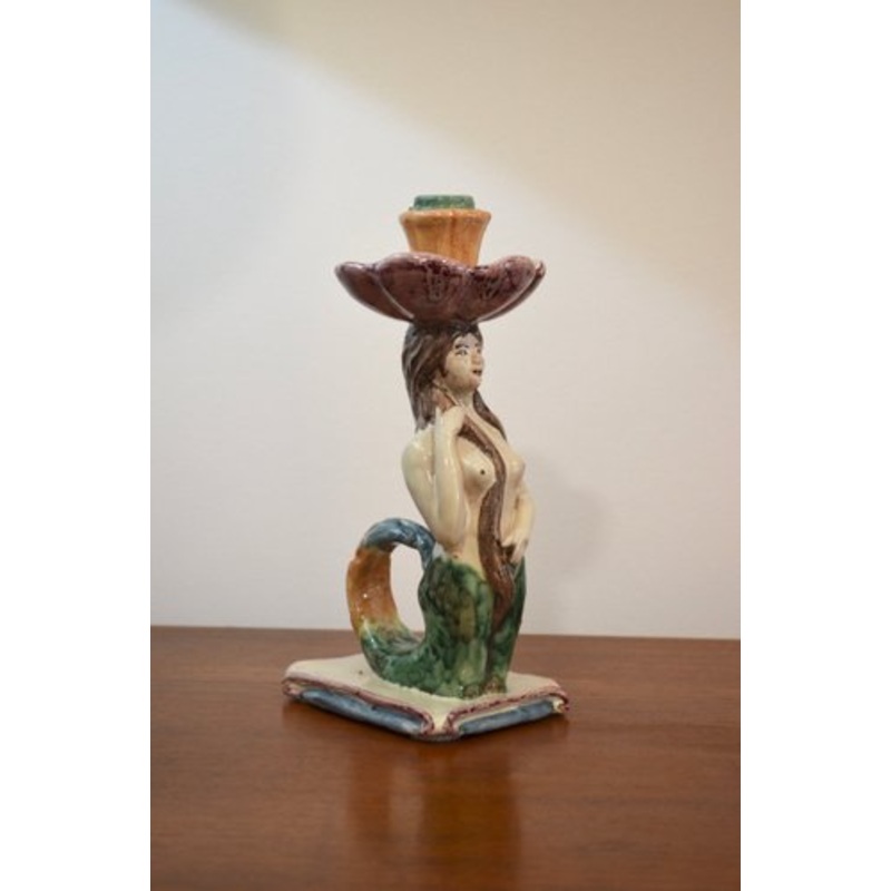 Magnificent ceramic mermaid statuette / candle holder, Italian production from the 2nd half of the 20th century. The mermaid’s tail forms the handle of the candle holder.