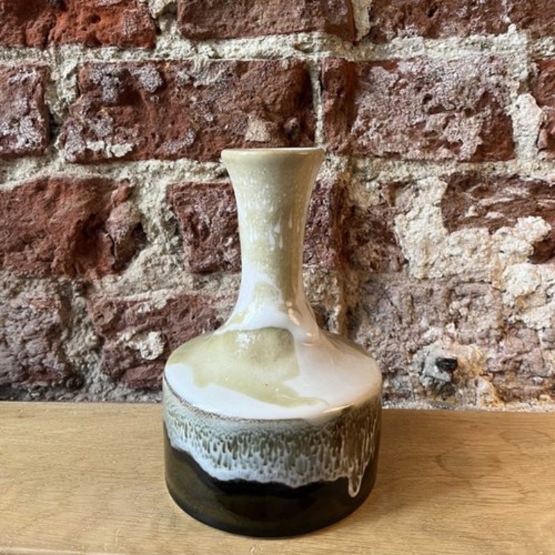 Unique stoneware vase with matte white, cream and brown glaze. Impressed monogram