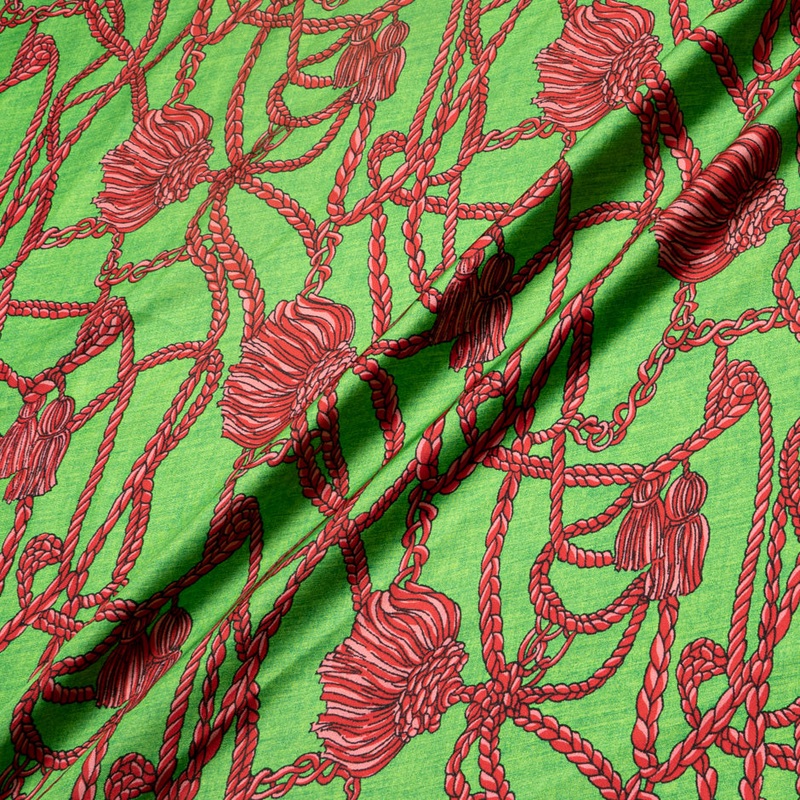 A rich apple green silk twill with a fun cerise pink rope and tassel print. Available in a variety of colours, this lightweight silk is suitable for dresses, shirts and skirts.
